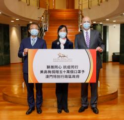 美高梅時刻關注疫情發展,過去一星期內積極推出多項支援抗疫防控的舉措,與澳門各界攜手應對疫情。今天,在澳門社會對口罩的需求日漸急切情況下,美高梅捐出50萬個外科口罩予澳門特別行政區政府,支持政府的抗疫防控工作,與政府肩並肩為社會伸出援手。整批口罩全數由美高梅中國控股有限公司首席執行官及執行董事簡博賢先生以及總裁、首席戰略官及董事馮小峰先生贈予特區政府,由社會文化司歐陽瑜司長代表接收。